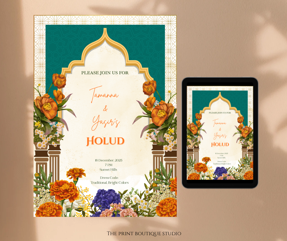 Beautiful, floral designed invitation card perfect for Holud or Mehendi celebrations. It has a touch of both traditional and modern design.